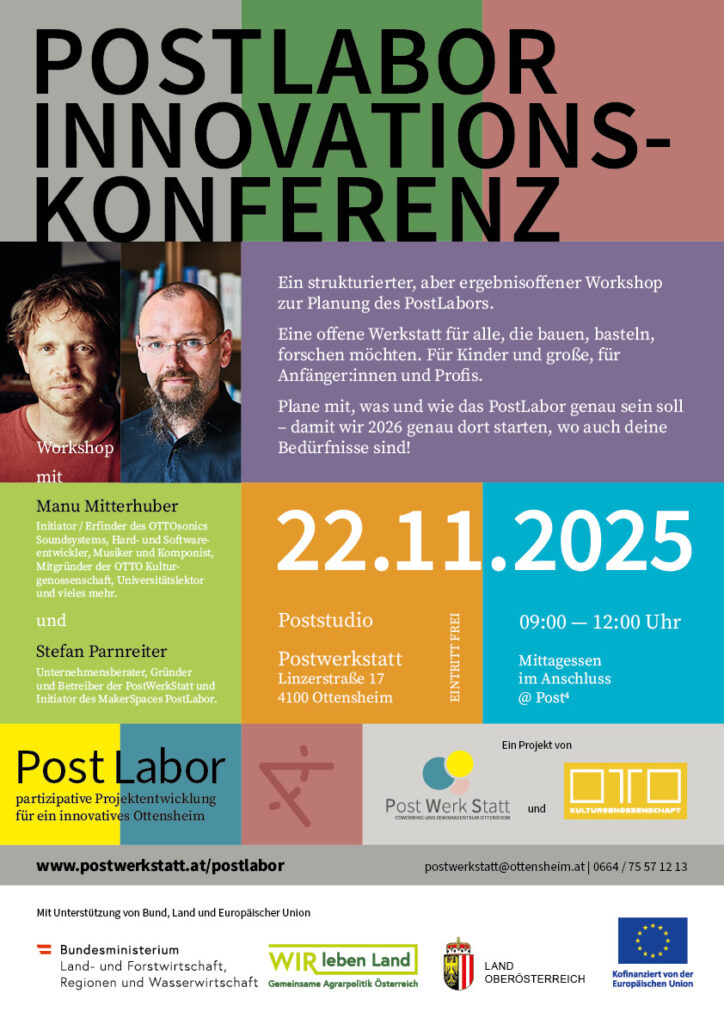 PostWerkStatt CoWorking und Seminarzentrum Ottensheim und die OTTO Kulturgenossenschaft haben sich 2024 zur ARGE PostLabor zusammengeschlossen, um mit möglichst breiter Einbindung der lokalen Bevölkerung zu erarbeiten, wie wir im weiteren Feld geteilter Produktionsmittel, geteilten Wissens, gemeinsam genutzter Ressourcen im Feld der Hightech-Produktion und der Befähigung/Wissensvermittlung neue Angebote entwickeln und setzen können.